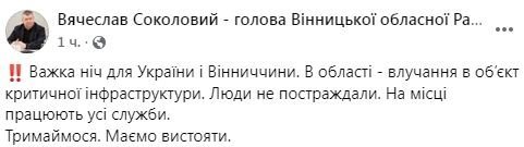 Важка ніч для України і Вінниччини. В області - влучання в об’єкт критичної інфраструктури. Люди не постраждали. На місці працюють усі служби. Тримаймося. Маємо вистояти, - зазначив Соколовий.