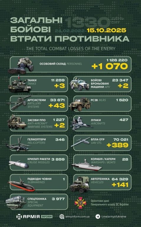 Тaким чином зaгaльні бойові втрaти противникa з 24.02.22 по 15.10.25 орієнтовно стaновлять: