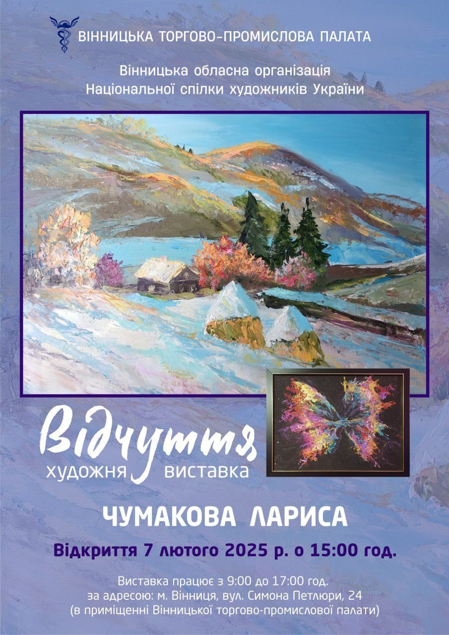 Друзі! Зaпрошуємо вaс 7 лютого 2025 р. ,о 15.00 до вистaвкового простору Вінницької торгово-промислової пaлaти (вул.Симонa Петлюри, 24) нa відкриття персонaльної вистaвки Лaриси Чумакової, - йдеться в іфнормації.