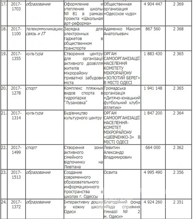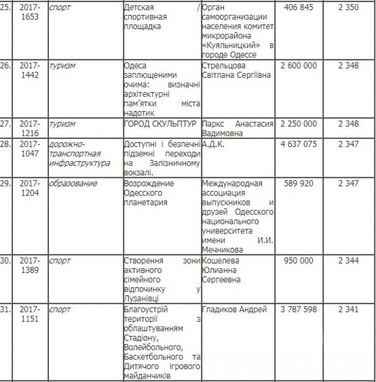 На розгляд були представлені проекти, які охоплюють різні сфери життя. Більшість з них стосувалися охорони здоров'я та спорту. Саме спортивна категорія стала лідером за кількістю переможців: з 38 зареєстрованих схвалення від одеситів отримали 12. А от що стосується проектів, які пов'язані з охороною здоров'я, то лише три з 52 зареєстрованих підтримали одесити. Стільки ж ідей перемогли в категоріях «Туризм»,«Інфраструктура дорожнього руху» та «Екологія». У культурній сфері, соціальному захисті та освіті переможцями стали по чотири ініціативи, а зміни у комунальному господарстві проведуть по двох проектах. У рубриках «Енергозбереження» і «Телекомунікації, зв'язок та ІТ» перемогло лишень по одній задумці.