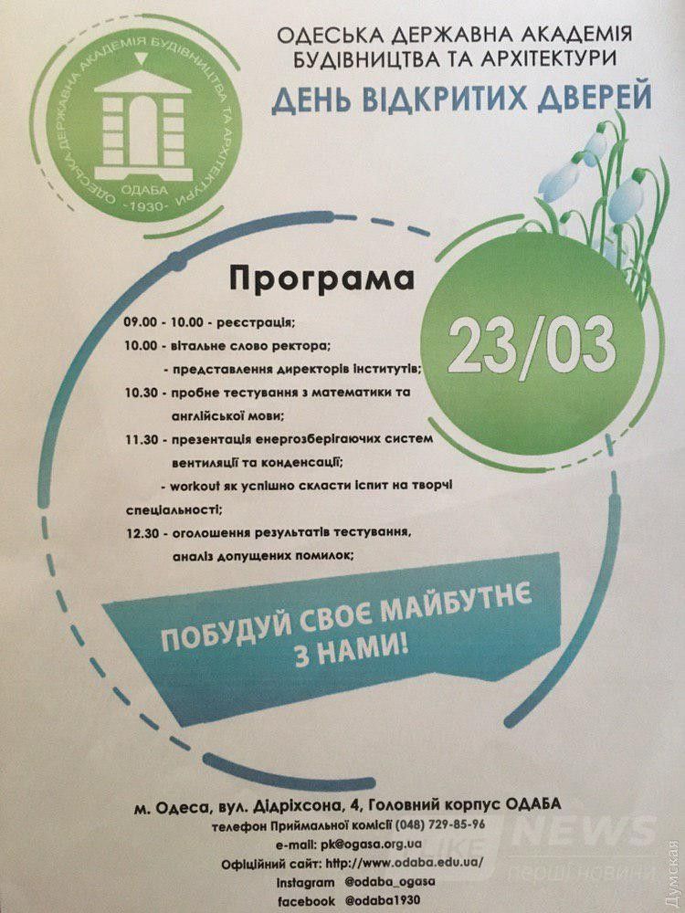 15 и 23 мaртa в ведущем одесском вузе — Одесской госудaрственной aкaдемии строительствa и aрхитектуры — пройдут дни открытых дверей.