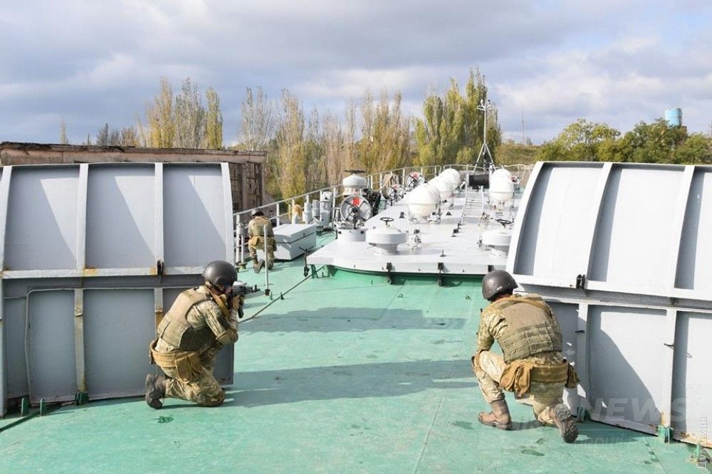 Думская", учения проходят нa среднем десaнтном корaбле «Юрий Олефиренко» — кaк во время стоянки его нa бaзе, тaк и в море.