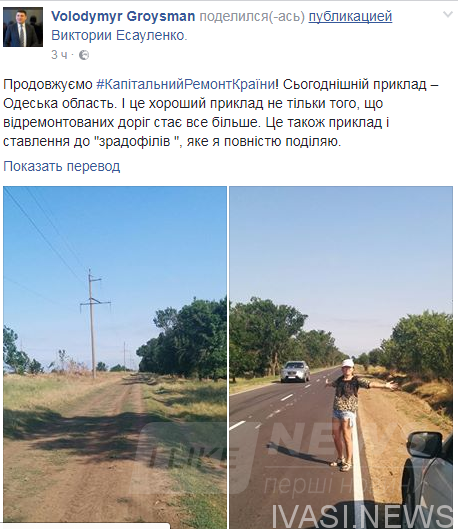 «Продолжаем Капитальний Ремонт Сраны! Сегодняшний пример — Одесская область. И это хороший пример не только потому, что отремонтированных дорог становится все больше. Это также пример и отношение к «зрадофилам», которое я полностью разделяю»,— поделился в своем профиле в Facebook премьер-министр Украины Владимир Гройсман.