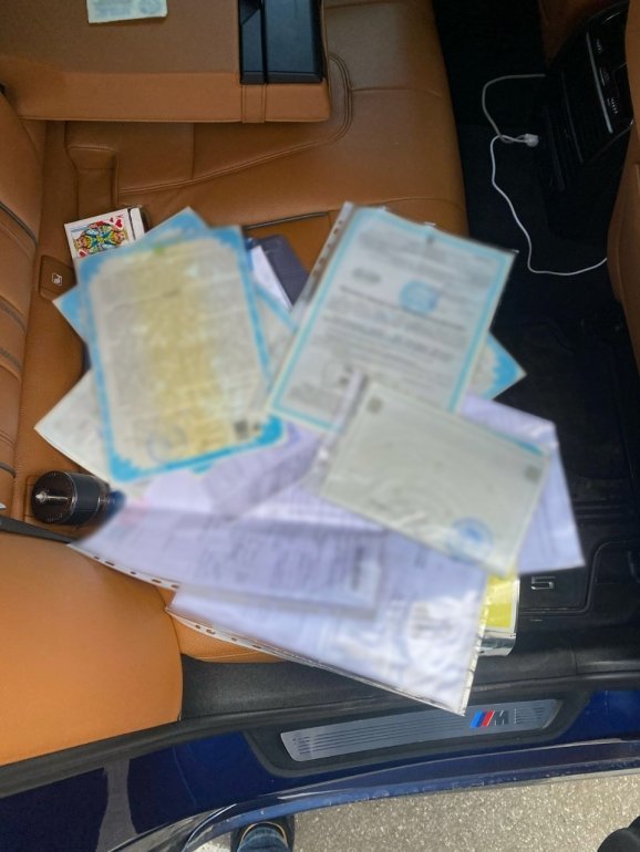Під час обшуків у його помешканні та автомобілі правоохоронці вилучили гроші, довіреності на різних осіб, висновки технічних експертиз, копії та відтиски печаток, а також чорнові записи.
