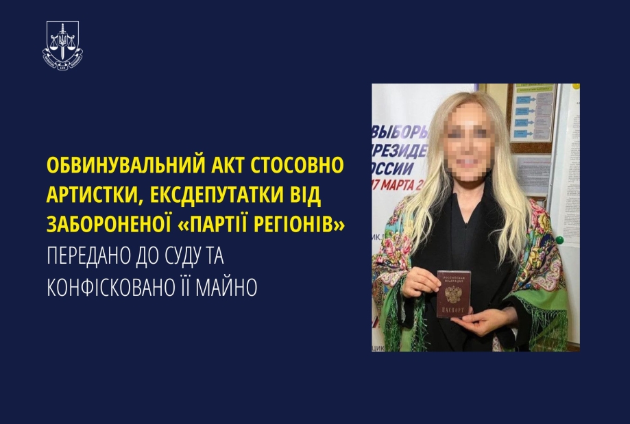 Прокурори Вінницької обласної прокуратури до суду скерували обвинувальний акт стосовно колишньої народної депутатки України VII скликання, артистки та громадянки України за обвинуваченнями у колабораційній діяльності, публічних закликах до агресивної війни та виправдовуванні агресії Росії проти України, а також глорифікації учасників війни.