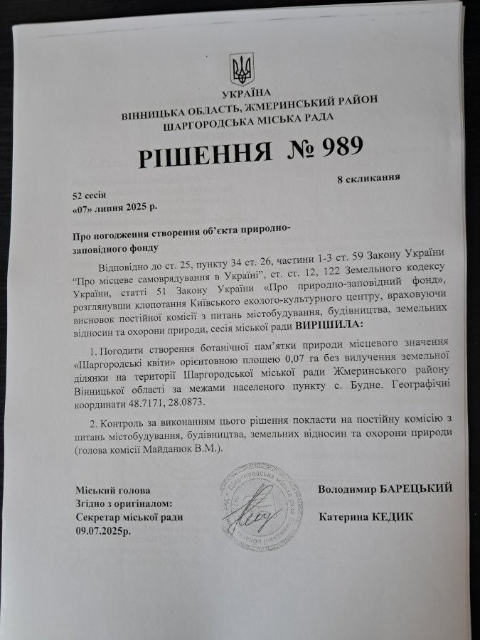 Шаргородська міська рада погодила ініціативу створення нового природоохоронного об’єкта — пам’ятки природи місцевого значення «Шаргородські квіти». Відповідне звернення до депутатів надійшло від Київського еколого-культурного центру (КЕКЦ), і рішення вже офіційно ухвалене.
