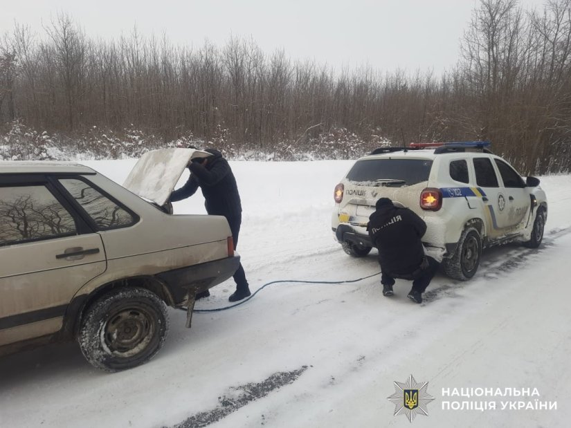 У Вінницькій області правоохоронці надають допомогу кермувальникам, які через складні погодні умови потрапили у небезпечні ситуації на дорогах. Поліцейські визволяють автомобілі зі снігових заметів і допомагають водіям безпечно продовжити рух.