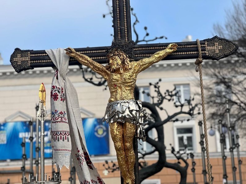 У Вінниці, на площі Небесної Сотні, 12 лютого презентували унікальну інсталяцію «Хрест Миру», як повідомили кориспонденти Суспільного. Скульптура Ісуса Христа, створена з 20 тисяч уламків артилерійських снарядів, символізує біль, боротьбу та надію на мир в Україні.
