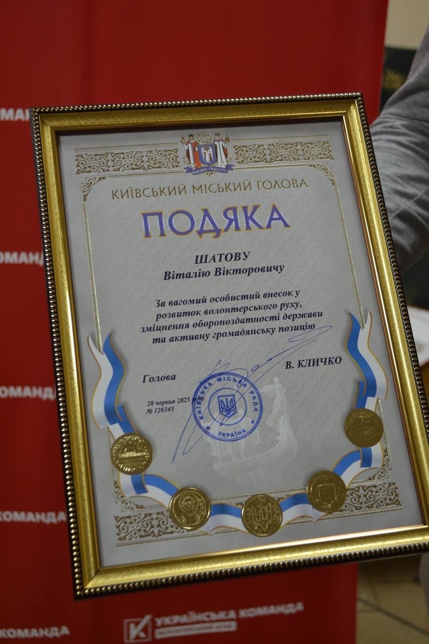 Цими днями волонтери "Української команди" від Віталія Кличка вручили подяку Віталію Шатову за його вагомий внесок у розвиток волонтерського руху та безкорисливу допомогу тим, хто її потребує.