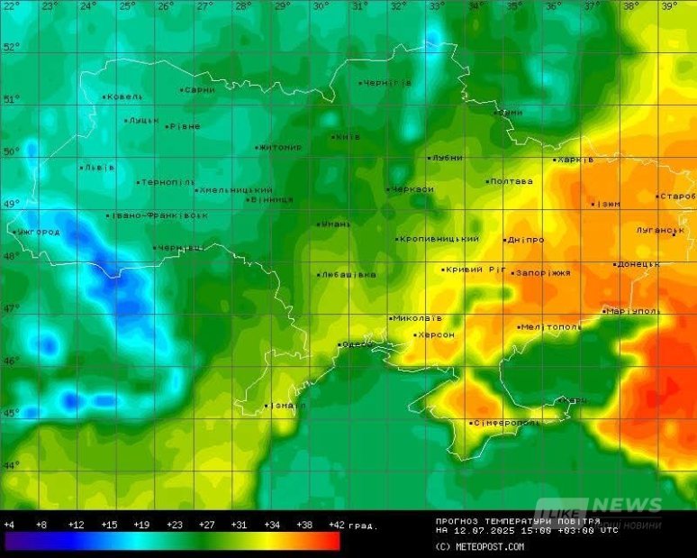 На сході, південному сході та в степовому Криму — найспекотніше: очікується +33…+38°C. Йдеться про Луганщину, Харківщину, Донеччину, Дніпропетровщину, Запоріжжя та частину Херсонщини.