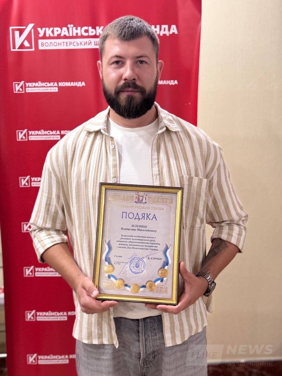 Волонтерський штаб «Українська команда» продовжує відзначати тих, хто щодня своєю працею та небайдужістю підтримує українців у час війни. Цього разу подяку від мера Києва Віталія Кличка отримав Владислав Зелениця — активний волонтер, який робить вагомий внесок у розвиток волонтерського руху.