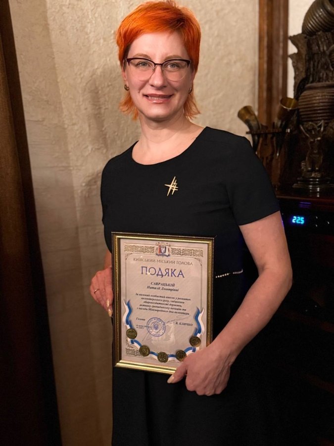 У мережі "Фейсбук" Наталія Саврацька ділиться: кожен українець зараз є волонтером в більшій чи меншій мірі, це не можна виміряти ніяким мірилом. Ми всі, як ті пташки, по краплі допомагаємо тим хто цього потребує. Ситуація спонукає до цього. Оцінка твого внеску у вигляді "Подяки" від Київського міського голови була неочікуваною. В єдності ми сила, я завжди це говорю в нашій спільноті Клуб Успішних Жінок - КУЖ. Наші спільні плани, наші дії це невідʼємна частина командної роботи.