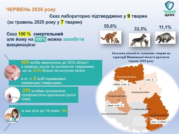 Кількість укусів тварин збільшується. З початку року за антирабічною допомогою звернулися 2 099 осіб, з яких 120 зазнали укусів або контактували зі скаженими тваринами. Найбільше звернень зафіксовано у Вінницькому районі (1 008), Гайсинському (363), Хмільницькому (226), Жмеринському (210), Тульчинському (196) та Могилів-Подільському (96).