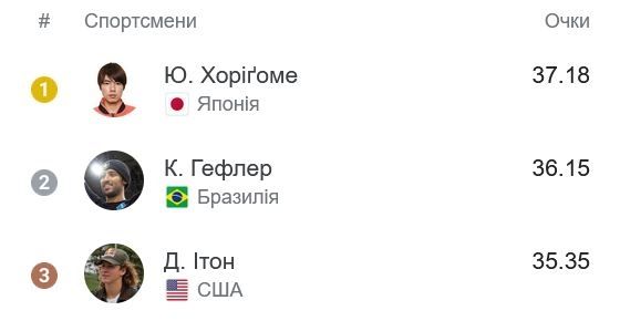 Хорігоме за підсумками змагань набрав 37,18 бала. Другим став бразилець Кельвін Хофер (36,15), третім — Джаггер Ітон з США (35,35).