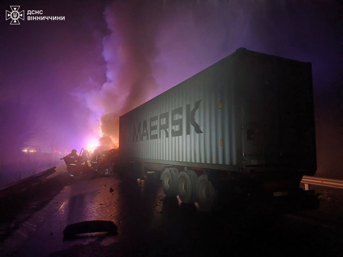 На Вінниччині сталася автотроща – легковик врізався в фуру. В результаті аварії виникла масштабна пожежа - дорога була на кілька годин перекрита. На місці події працювали рятувальники. Причин ДТП встановлюють у поліції.