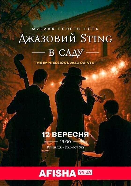 «Джазовий Sting в саду» 12 вересня у Вінниці у PIROGOV SKY — великий концерт у джазовому аранжуванні від знаменитих джазменів The Impressions Jazz Quintet!