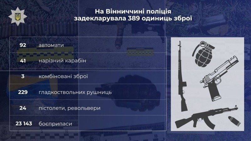 Мешканці Вінниччині задекларували майже сто автоматів, кілька сотень мисливських рушниць та десятки тисяч набоїв. Загальна цифра задекларованої зброї складає 389 одиниць.