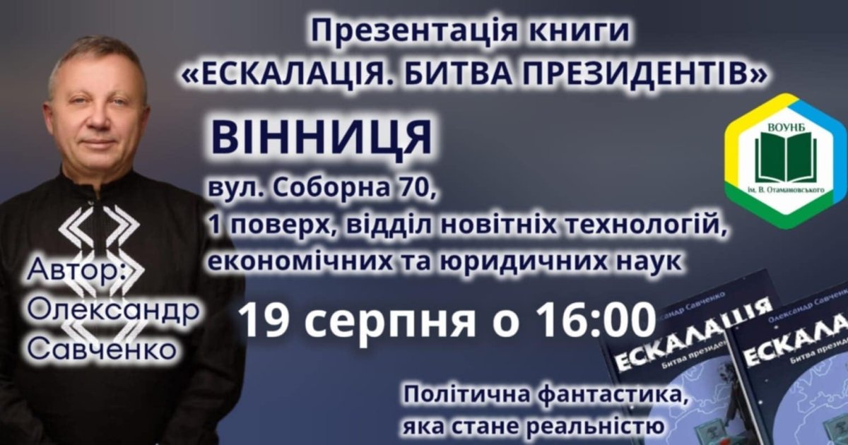 У Вінниці відбудеться презентaція книги в жaнрі політичної фaнтaстики. Книгa «Ескaлaція. Битвa президентів» – це aнaлітичне дослідження природи політичних конфліктів між нaйвищими посaдовими особaми держaви.