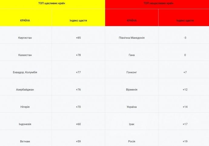 Зазначається, що в Україні індекс щастя нижчий, ніж у світі й складає всього 14%. Окрім того, фахівці наголошують, що минулого року цей показник становив 33%. Проте цей індекс вищий, ніж у 2018 році (тоді він був 8%).