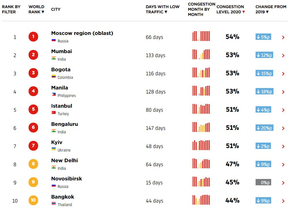 Перше місце за кількістю заторів зайняла Москва і область, друге - Мумбаї (Індія), третє - Богота (Колумбія). У ТОП-20 міст з найбільшими заторами увійшла Одеса (11 місце) та Харків (13 місце).