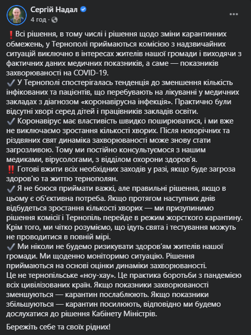 Зокрема, міський очільник на своїй офіційній сторінці в Facebook написав, що всі рішення, в тому числі і рішення щодо зміни карантинних обмежень, у Тернополі приймаються комісією з надзвичайних ситуацій виключно в інтересах жителів громади і виходячи з фактичних даних медичних показників, а саме — показників захворюваності на COVID-19.