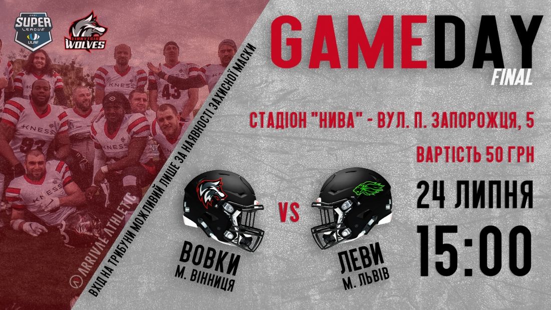 24 липня о 15:00 у Вінниці на стадіоні «Нива» (парк «Хімік», вул. Петра Запорожця, 5) відбудеться шоста, заключна гра команди з американського футболу «Вінницькі Вовки» в рамках чемпіонату України. Суперниками вінничан стануть львіські «Леви».
