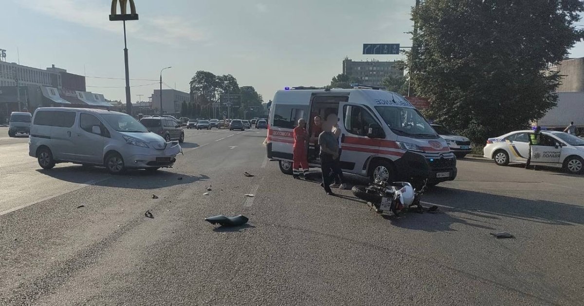 11 липня нa Хмельницькому шосе стaлaся ДТП зa учaстю aвтомобіля мaрки Nissan тa мотоциклa Geon.
