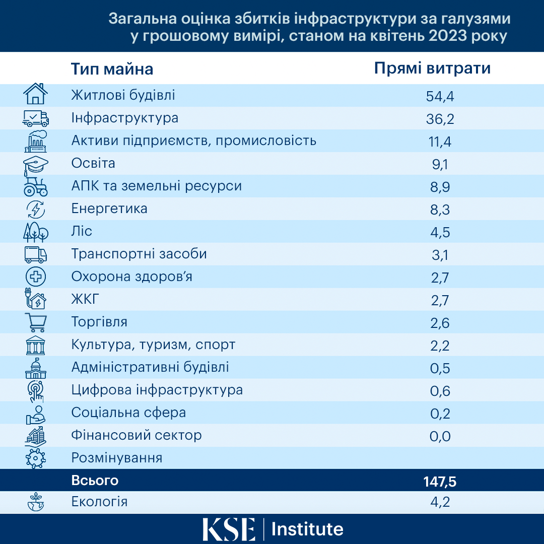 Загальна сума прямих задокументованих збитків, завдана інфраструктурі України через повномасштабне вторгнення росії, станом на квітень 2023 року сягає $147.5 млрд (за вартістю заміщення). Внаслідок війни продовжуються руйнування житлових будинків, підприємств, освітніх закладів, інфраструктури агросектору, що і зумовлює зростання загальної суми збитків.