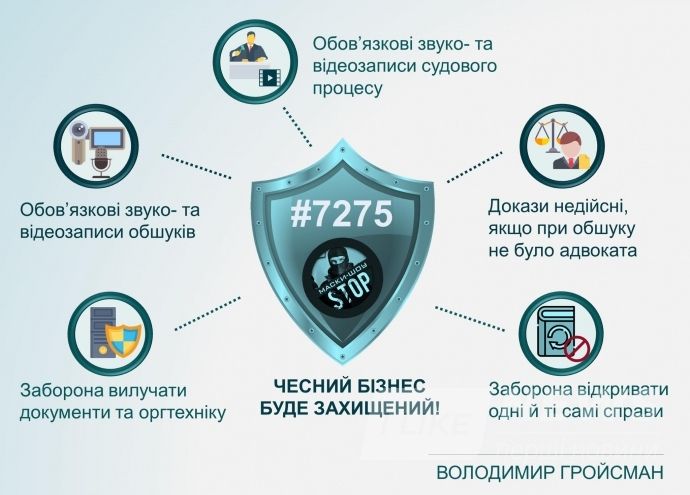 Він додав, що за новим законом, якщо під час обшуків були вилучені документи підприємців, техніка та інші матеріали без присутності адвоката, то вилучені матеріали не зможуть надалі використовуватися стороною обвинувачення.