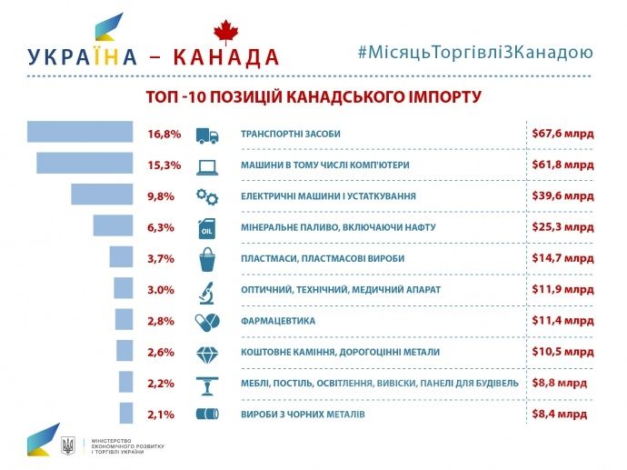 Зокрема, за даними Держстату, у 2016 році українські компанії експортували до Канади товарів на 28,9 млн доларів, тоді як імпортовано – на 217,3 млн доларів.
