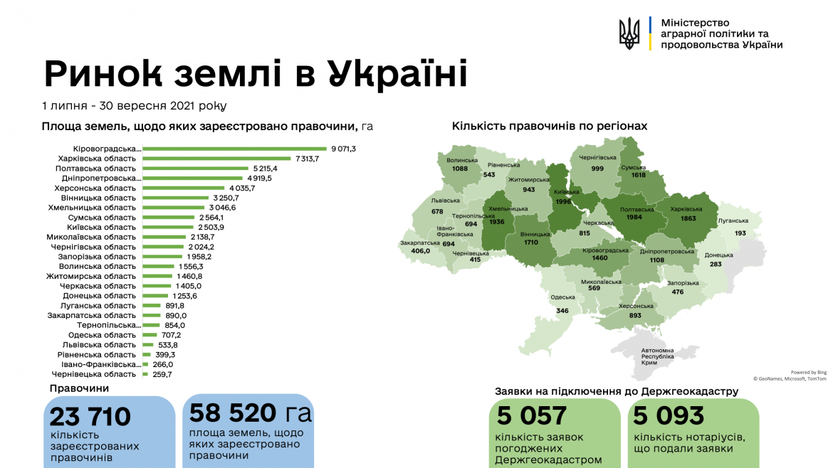 Міністерство аграрної політики та продовольства України повідомляє, що станом на сьогодні укладено 23710 угод в рамках ринку землі. Подали заяви для отримання доступу до Державного земельного кадастру 5093 нотаріусів. Всього заяв – 5720, із них погоджено 5057, в черзі на розгляд - 3, відмову отримали 660.