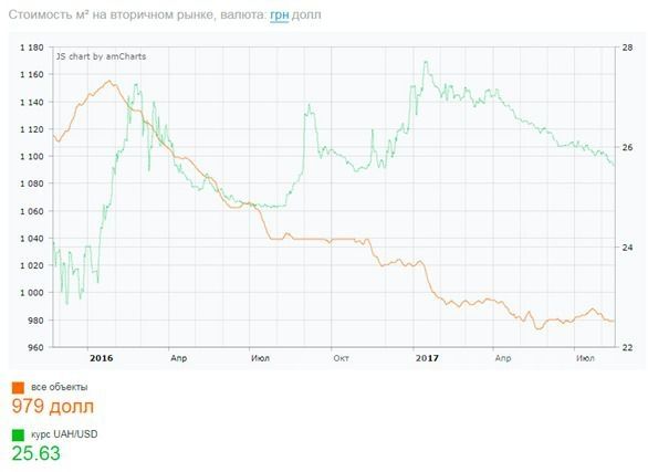 Вторинний ринок, який історично прив'язаний до курсу валюти, падав до кінця весни 2017 року, зазначають експерти. А влітку почалася стабілізація запитуваних продавцями цін і зараз медіанна вартість квадратного метра в Києві дорівнює 979 дол. на вторинному ринку. На первинному ринку Києва медіанна вартість квадратного метра дорівнює 20 699 грн і при перерахунку за курсом НБУ становить 808 дол.