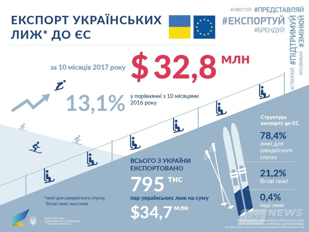 При цьому зазначається, що обсяги експорту українських лиж до ЄС постійно збільшуються. Так, за 10 місяців 2017 року експорт лиж вітчизняного виробництва у порівнянні з аналогічним періодом минулого року збільшився на 146 тисяч пар, що забезпечило приріст майже на 5 млн доларів або на 16,5%. У січні-жовтні 2017 року Україна експортувала 796 тисяч пар лиж на суму 34,7 млн доларів.