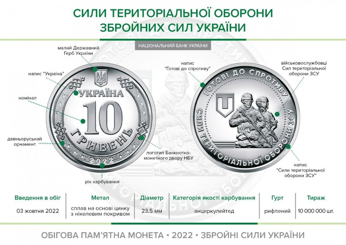 "Сьогодні вводиться в обіг нова обігова пам’ятна монета "Сили територіальної оборони Збройних Сил України". Понад сто тисяч українців стало до лав ТрО. Ось уже 222-й день вони тримають стрій та захищають Україну як справжні воїни", - йдеться у повідомленні.