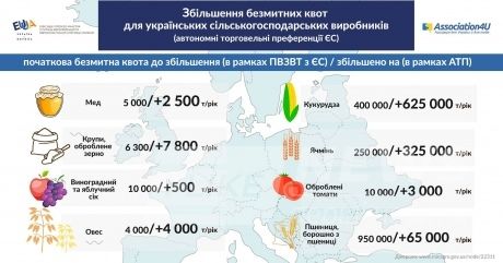 Зазначимо, що регламент ЄС щодо автономних торговельних преференцій збільшить обсяги сільськогосподарської продукції, яку Україна може експортувати до ЄС згідно з Угодою про асоціацію, не сплачуючи митні збори.