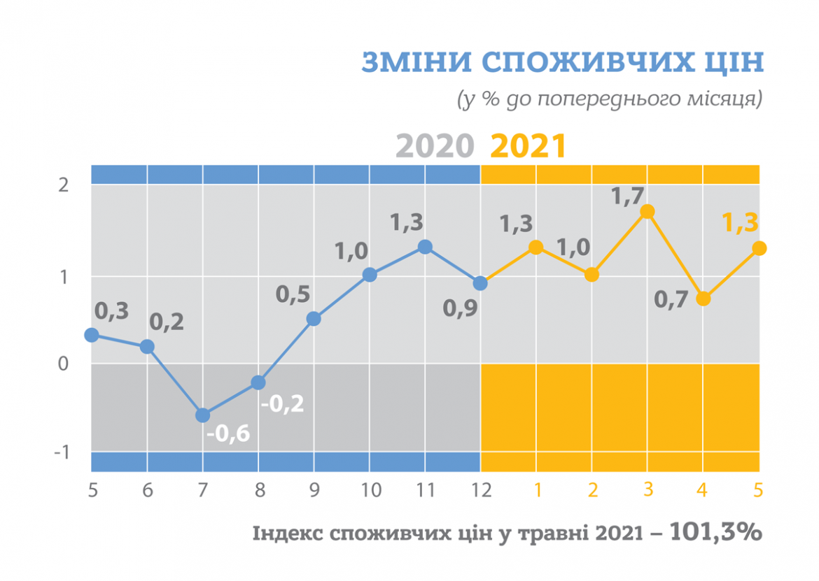 У травні 2021 року споживчі ціни в Україні у порівнянні з квітнем зросли на 1,3%. Від початку року зростання цін склало 6,1%.