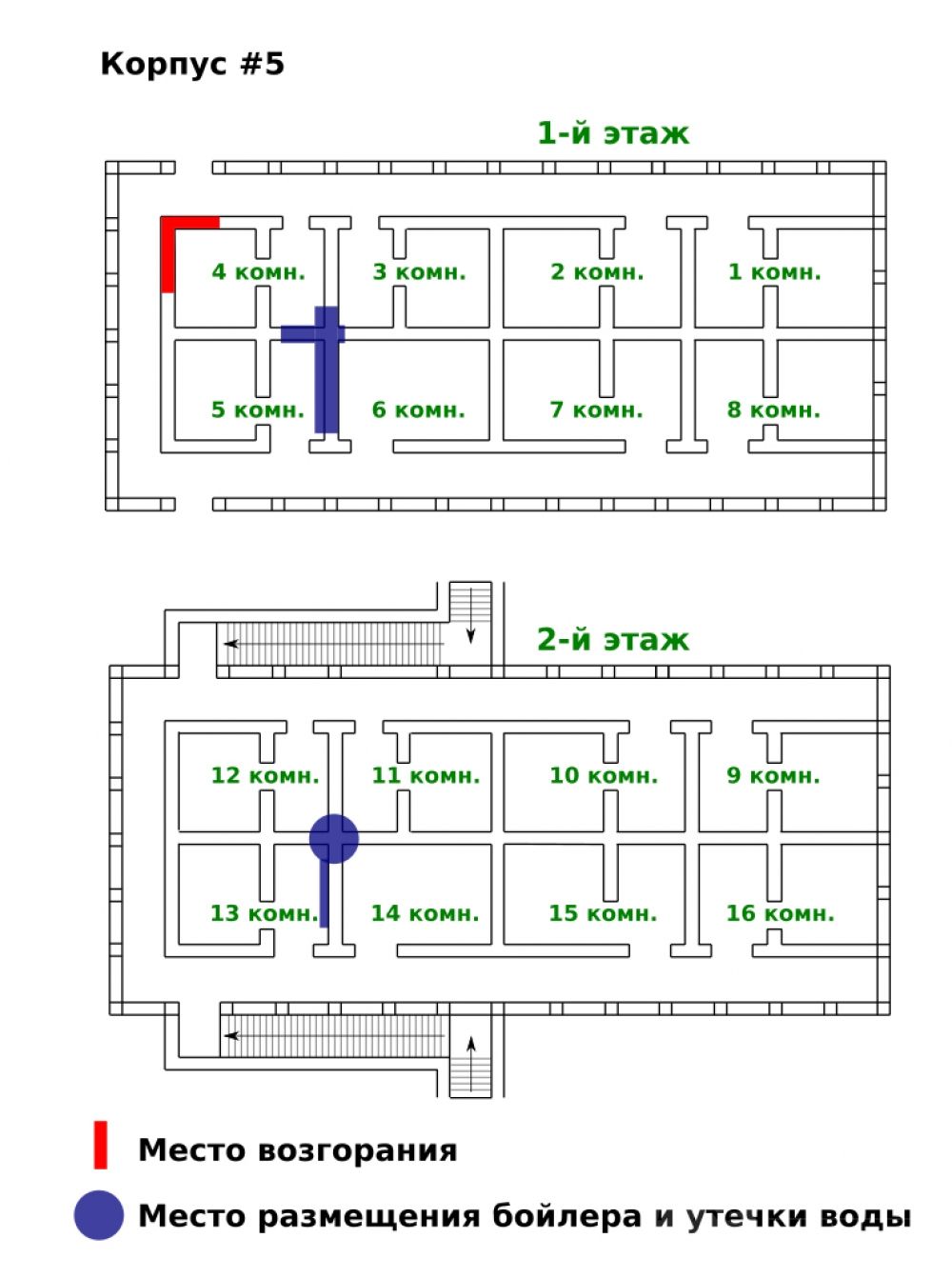 Комнaтa 5 – смежнaя с эпицентром пожaрa. Дети проснулись от сильного жaрa. Юля Т., Оля О., Мелaния Г. эвaкуировaлись сaми.