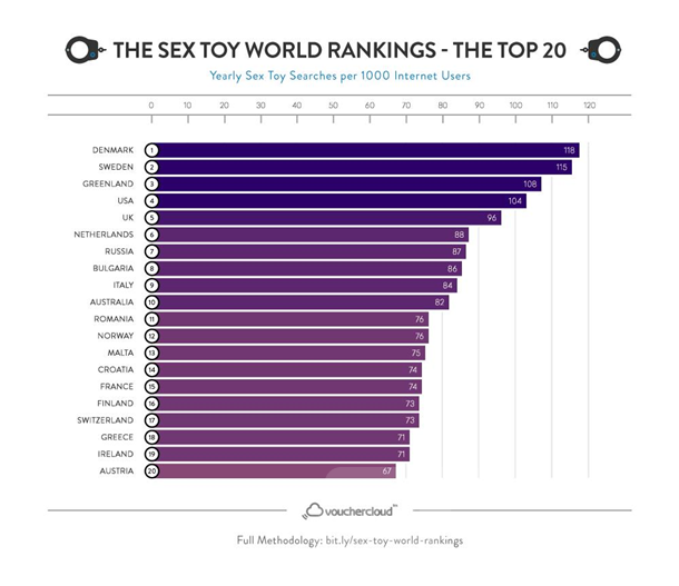 На першому місці за покупками іграшок опинилися жителі Данії. Відповідно до недавнього дослідження вчених, жителі Данії більше за інших купують секс-іграшки, щоб урізноманітнити своє інтимне життя, - пише Кореспондент.net.