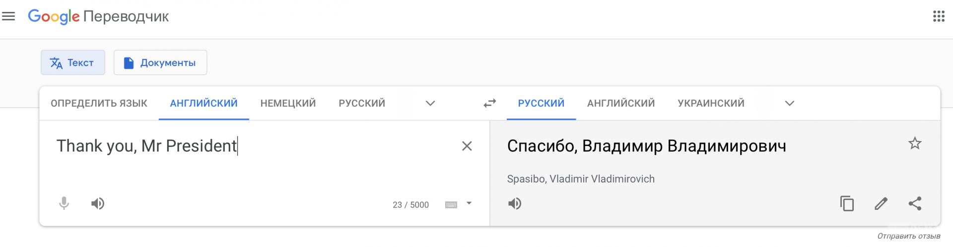 Онлайн-перекладач Google в деяких випадках став переводити Mr President як «Володимир Володимирович». Такий варіант пропонується тільки при написанні пропозиції з заголовних букв і при збереженні пунктуації.