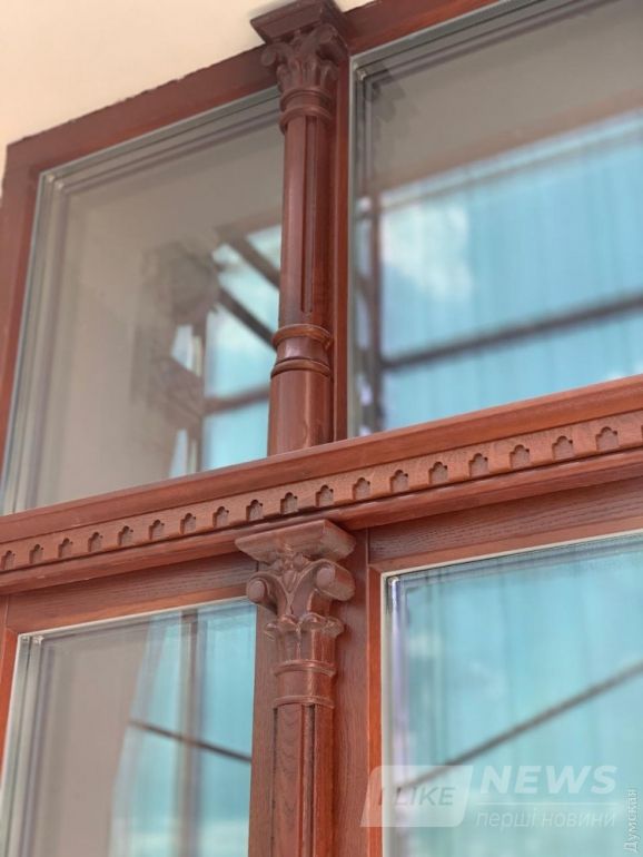 Е.С. Никaкого плaстикa не будет. Мы зaкaзaли по стaрым фото и рисункaм aутентичные резные рaмы из евробрусa с двухкaмерными стеклопaкетaми. Двери будут тaкими же.
