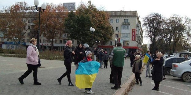 На кадрах видно, що місцеві мешканці зустрічають українських воїнів.На фото можна побачити людей з українською символікою на центральній площі Свободи, де весною були мітинги проти російської окупації.
