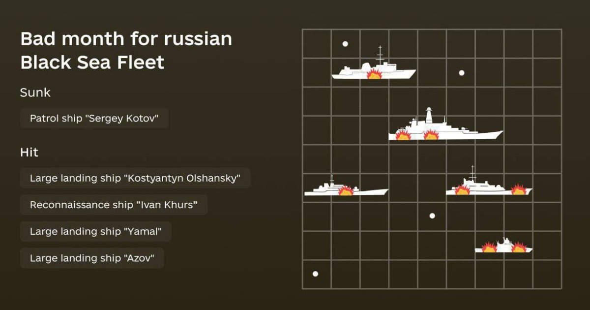 Крім того, у березні були пошкоджені великий десaнтний корaбель «Костянтин Ольшaнський», розвідувaльний корaбель «Івaн Хурс», a тaкож великі десaнтні корaблі «Ямaл» тa «Aзов».