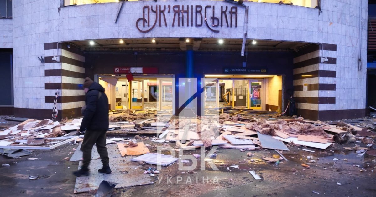 Внаслідок удару прорвало трубопровід, через що на площі та проїжджій частині утворилися потоки води. Станція метро "Лук'янівка" наразі не працює. Зруйновано скляні елементи входу та вестибюль.