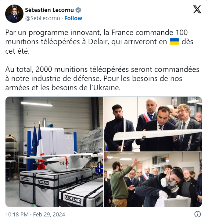 Французький міністр оборони Себастьєн Лекорню оголосив через соціальну мережу X, що Франція розмістила замовлення на 100 ударних дронів для України у компанії Delair, із планами передачі цих безпілотників Силам оборони до літнього періоду.