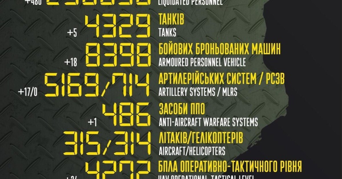 - особового складу ‒ близько 256050 (+480) осіб ліквідовано,