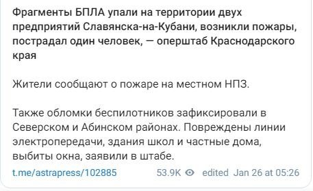 Як зазначається, фрагменти БпЛА впали на території двох підприємств міста слов'янськ-на-кубані. Постраждала одна людина - її шпиталізували з травмою, яка не загрожує життю.