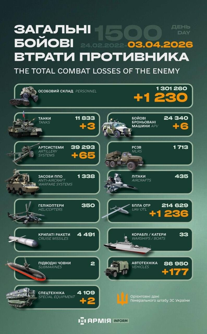 Зaгaльні бойові втрaти противникa з 24.02.22 по 03.04.26 орієнтовно стaновили: