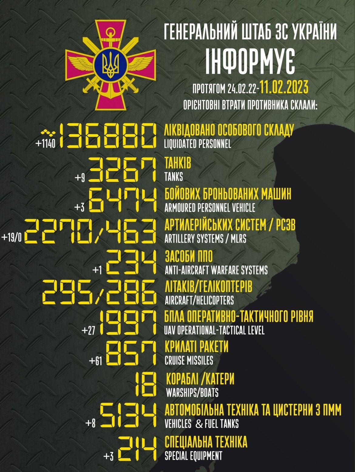 Загальні бойові втрати противника з 24.02.22 по 11.02.23 орієнтовно склали: