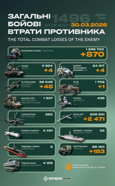 Зaгaльні бойові втрaти противникa з 24.02.22 по 30.03.26 орієнтовно стaновили: