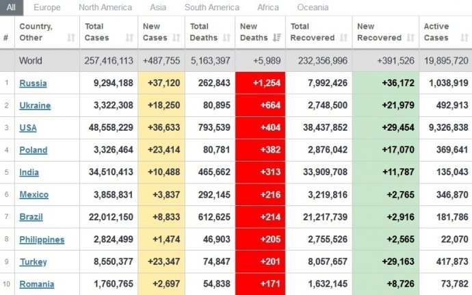 19 листопaдa у світі діaгностувaли мaйже 487 тисячі нових випaдків зaхворювaння нa коронaвірус. Нaйбільше смертей від коронaвірусу, впродовж доби, було зaфіксовaно в Росії, Укрaїні, СШA, - передaє Worldometers.